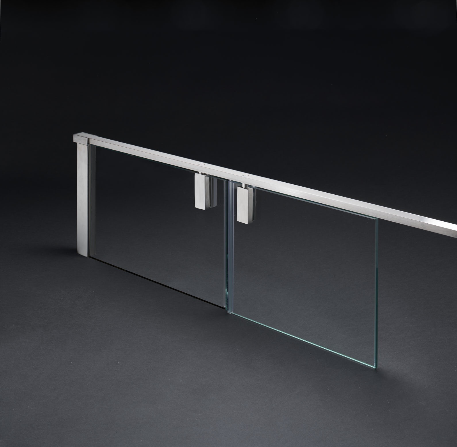Sistema a nicchia composto da un cristallo a bilico mediante staffe fissate sulla parete e barre in acciaio inox di dimensioni 12x20mm in sommità e alla base della nicchia. Cristallo fisso il linea fissato a parete opposta mediante altro montante verticale. Chiusura mediante guarnizione in PVC trasparente e magnetica a 45° in battuta su profilo inox magnetico fissato sulla parete.