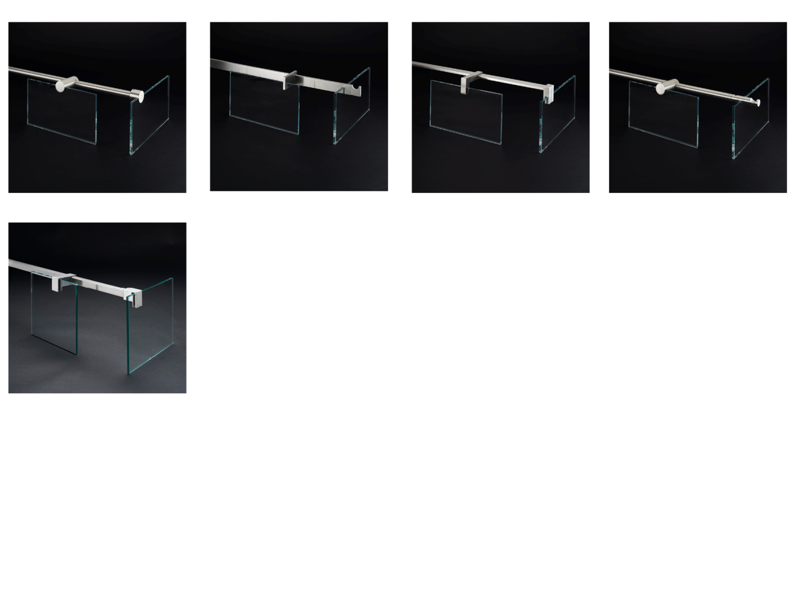 Sistema walk-in composto da un cristallo fissato a parete mediante montante in acciaio inox al quale a sua volta tramite staffe angoli vi è fissata un antina perpendicolarmente. In sommita, un tirante stabilizzatore collega i due cristallo alla parete retrostante.