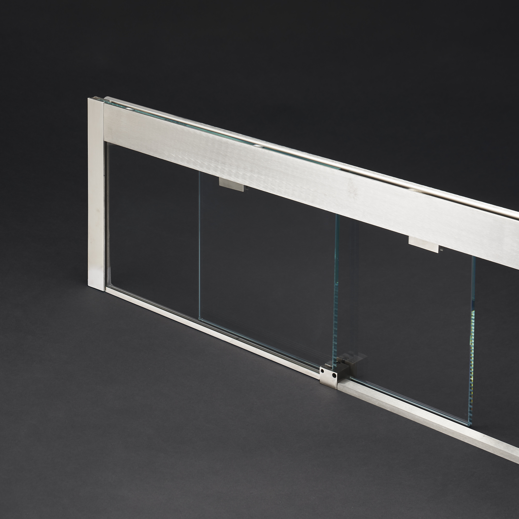 Sistema scorrevole ad angolo, composto da due cristalli fissi (frontale e laterale), fissati a parete mediante montanti in acciaio inox, ai quali, in sommità vi è fissato, internamente, un telaio con sezione a "C" , mentre esternamente, una piattina in acciaio inox (5 cm). Il cristallo della porta presenta due carrelli superiori che scorrono all'interno della "C" che funge da binario, mentre inferiormente sono indirizzati da una guida e un profilo in acciaio inox 20mm x 20 mm che funge da diga, entrambi siliconati alla base. La porta chiude in appoggio sul cristallo laterale mediante guarnizione in PVC trasparente a palloncino, mentre, la tenuta all'acqua sul lato opposto tra porta e cristallo fisso frontale è garantita mediante una guarnizione ad ala in aderenza.