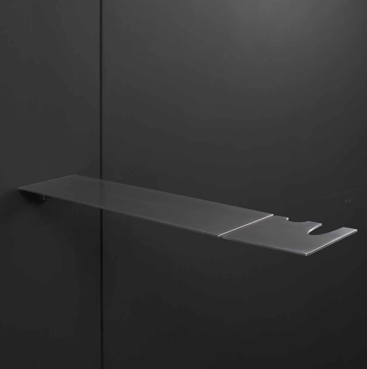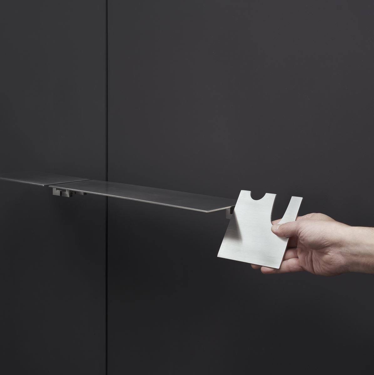Realizzata in acciaio inox e disponibile nelle otto finiture del catalogo, la mensola è composta da tre elementi armonicamente collegati. L’ultimo di essi è libero di ruotare di 90° attorno a un cardine decentrato, accuratamente inserito nella parte centrale fissa: un dettaglio che permette all’oggetto di assumere ruoli diversi, adattandosi ai gesti e alle abitudini dell’utente.