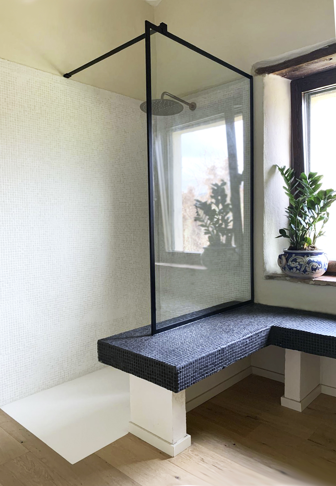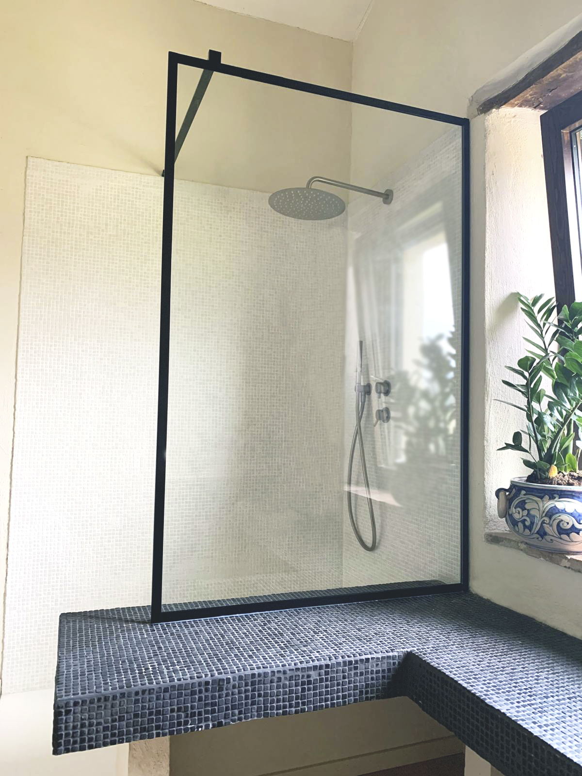 Sistema Walk-In, composto da un cristallo fisso laterale, montato in appoggio sul muretto. Il fissaggio tramite profilo in acciaio largo 25mm e profondo 13mm, fissato a parete, nel quale si inserisce il cristallo con telaio perimetrale in acciaio. Tra il cristallo ed il montante a muro è presente una coppia di guarnizioni a cuneo per permettere il serraggio dello stesso. In sommità al cristallo, un tirante stabilizzatore a sezione rettangolare fissato perpendicolarmente garantisce la stabilità della realizzazione.