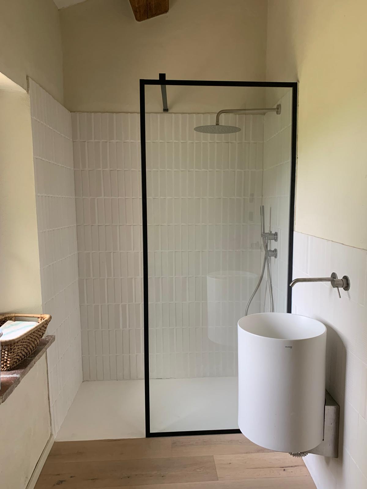 Sistema Walk-In, composto da un cristallo fisso, montato in appoggio sul piatto doccia. Il fissaggio avviene tramite profilo in acciaio largo 25mm e profondo 13mm, fissato a parete, nel quale si inserisce il cristallo con telaio perimetrale in acciaio. Tra il cristallo ed il montante a muro è presente una coppia di guarnizioni a cuneo per permettere il serraggio dello stesso. In sommità al cristallo, un tirante stabilizzatore a sezione rettangolare fissato perpendicolarmente garantisce la stabilità della realizzazione.