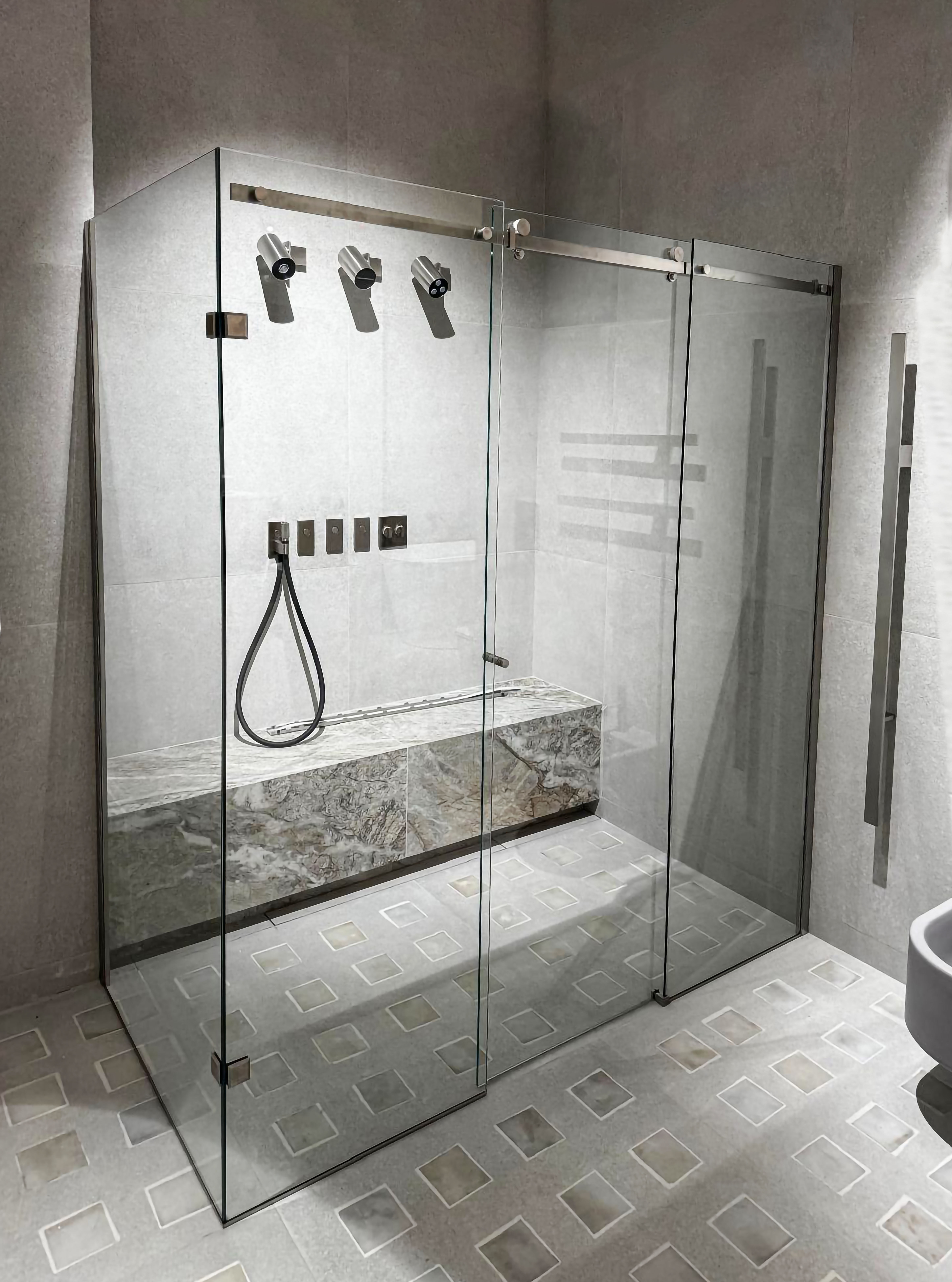 A completare il sistema è la maniglia a pomolo cilindrico. I quattro cristalli di sicurezza temprati da 8mm e gli elementi in acciaio inox offrono nel complesso una cabina doccia che i integra perfettamnte con il resto del bagno secondo i gusti e le esigenze del cliente.