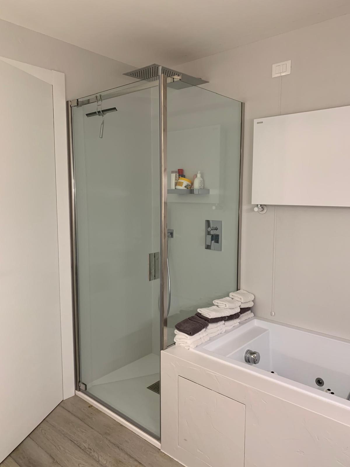 Y2_Angolare anta battente con cerniere su montante e cristallo fisso sopra vasca (Cm.80x80)